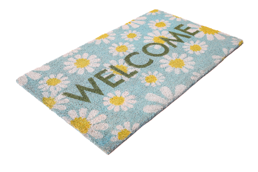 Personalised coir doormat, inscription WELCOME on a color background with flowers, to be placed on the floor