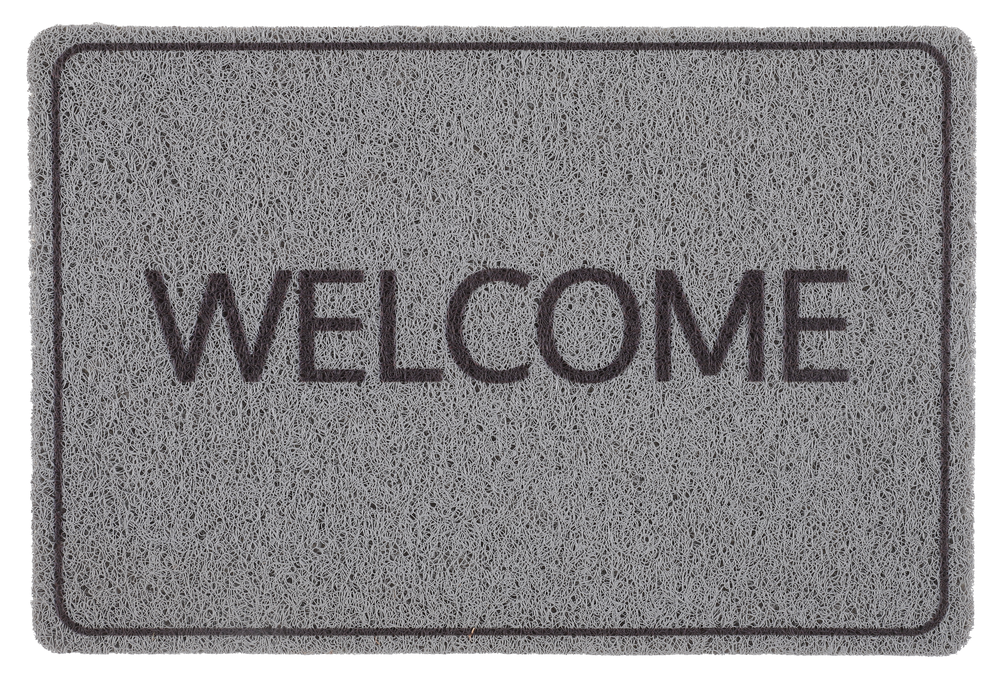 Customised doormat made in Polymerics, grey visual with welcome, to bring back to the ground